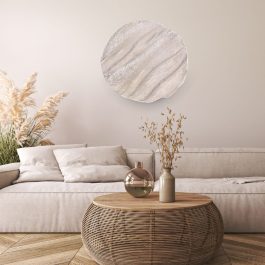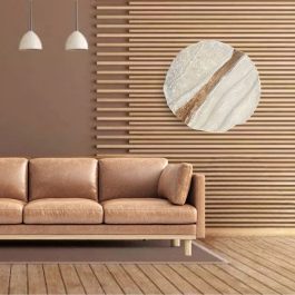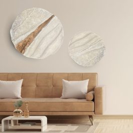 - אומנות קיר מקורית בעבודת יד המוסיפה אופי ויופי לחלל הבית. היא מורכבת מחמישה תבליטי קיר עגולים מבטון בגדלים ובטקסטורה שונה. יחד עם זאת משקל היצירה מתאים לתלייה על הקיר ללא חשש ממשקל כבד בזכות טכניקה ייחודית המאפשרת יצירת תבליטים מבטון במשקל קל. גודל היצירה הסופי כ- 2 מ'. ניתן להזמין בהתאמה אישית או לבחור מהקולקציה באתר