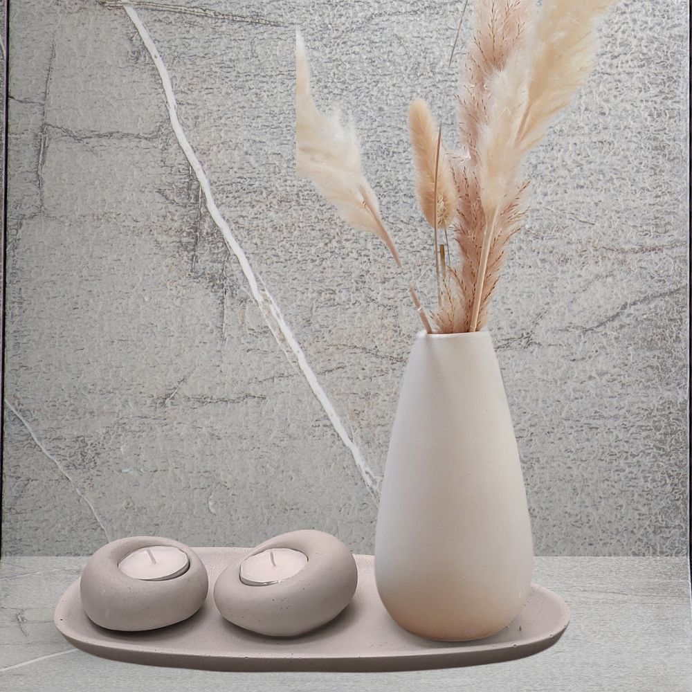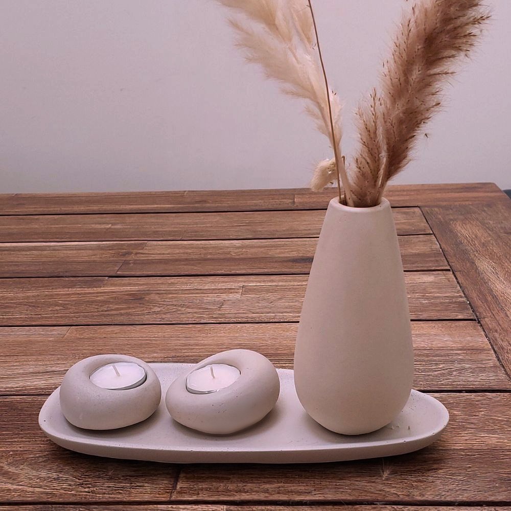 סט פמוטים ואגרטל מעוצב בעבודת יד מבטון ו על גבי מגש אובלי, מארז מקסים מתאים להדלקת נרות שבת וליצירת אווירה בכל חלל.