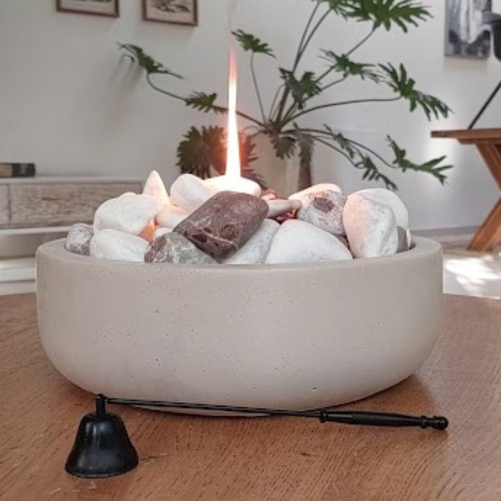 קערת אש מעוצבת בעבודת יד מבטון, פריט עיצובי ושימושי ליצירת אווירה.