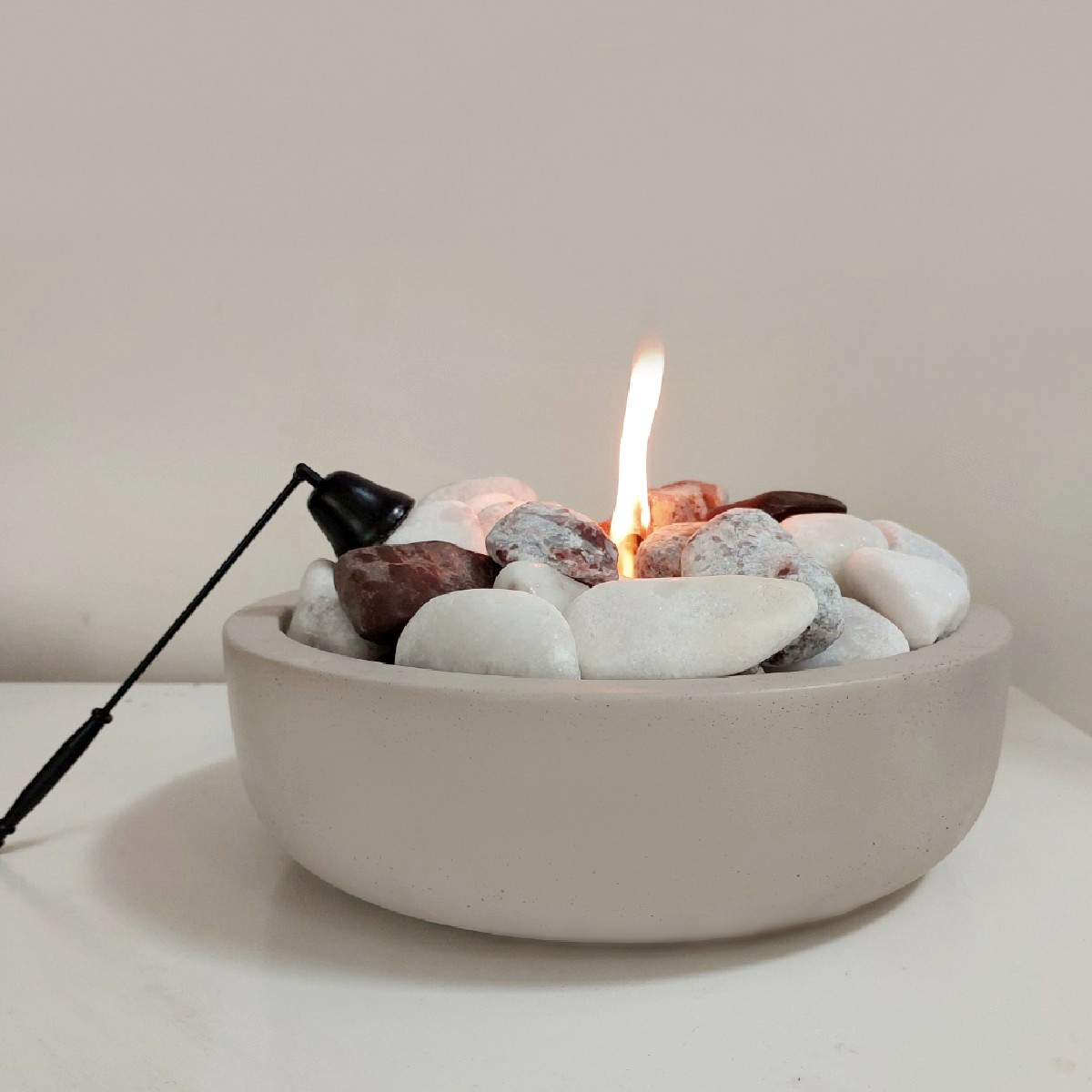 קערת אש בצבע אבן, מגיעה כסט עם חלוקי נחל בצבע לבן, ורוד וחום